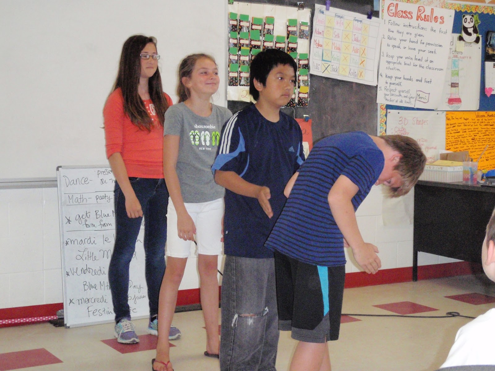 Students began the day by performing their dances. With Mme Bosse's class, students choreographed their own dance, then performed for both classes. There are a few more groups to perform tomorrow. Afterwards, we saw the final group from Mme Bosse's class present their skit.